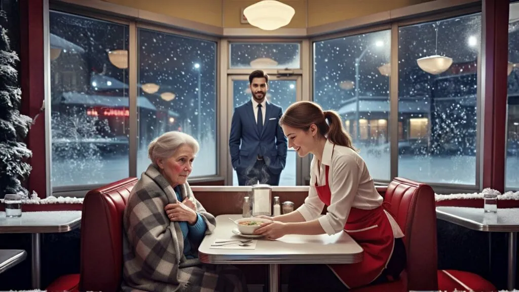 Jessica guided her to the nearest booth. Mr. Winters, could you turn up the heat? I’ll get some hot tea. Within minutes, Jessica had wrapped the woman in the emergency blanket she kept under the counter and placed a steaming mug of chamomile tea between her trembling hands.