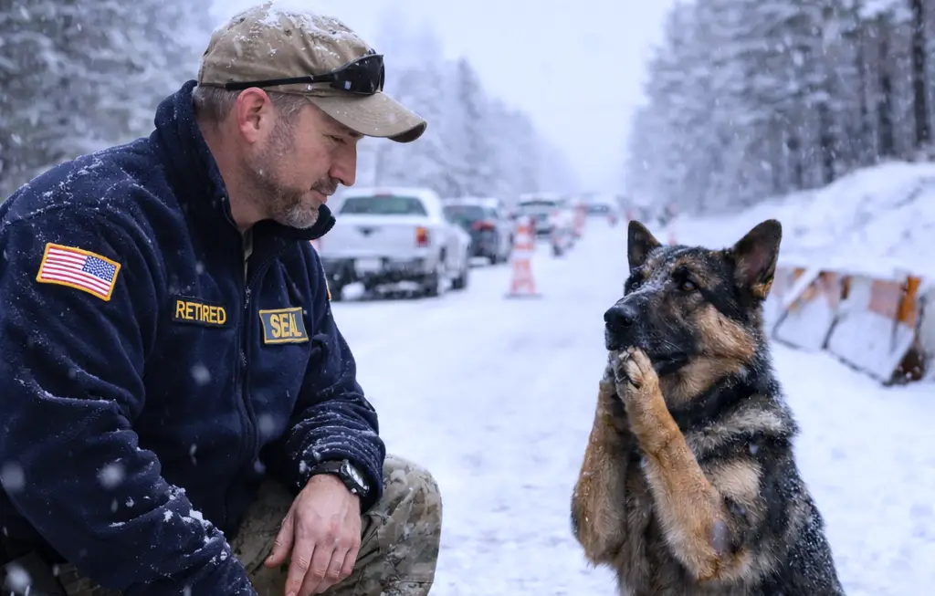 He lifted the bundle. The mother dog rose instantly. She didn’t jump or cower; she simply stood, fluid and controlled, and stepped back to give him operational space. When he turned back toward the truck, she fell in step beside his left knee, heeling perfectly without a command.