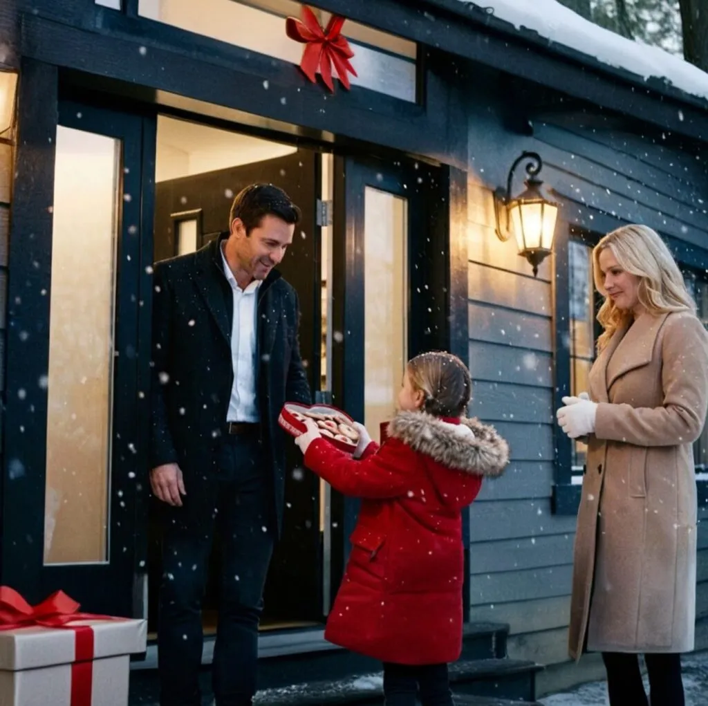 The world outside was hushed, glowing with lights and the faint sound of bells from the church tower downtown. The little girl in the pink dress stepped onto the porch, holding the tray steady. Then, with a giggle, she turned and knocked gently, once, twice, three times, on their own door.