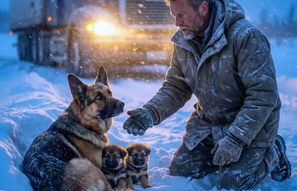 The wind howled through the mountain pass as he squinted through the passenger window. There, barely visible under a drifting bank of snow, was a large German Shepherd. Her fur was matted with ice. She was curled protectively around two tiny puppies.