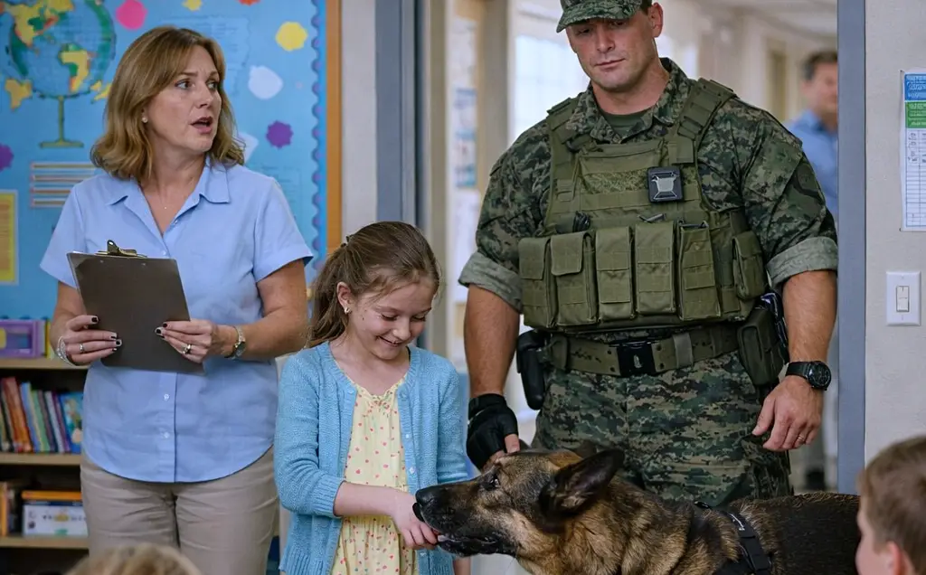 He had returned from that trip with new habits: scanning every room he entered, standing with his back against solid walls, and pausing before he spoke to weigh the cost of his words. Emily didn’t understand the tactical reasons for these behaviors; she only knew that when he looked at her, the tension in his shoulders finally released. When he made a promise, he kept it. The folder she clutched held more than just lined paper. It contained drawings she had labored over: her father in his camouflage utilities, a small American flag tucked in the corner, and beside him, a large, dark silhouette with pointed ears.
